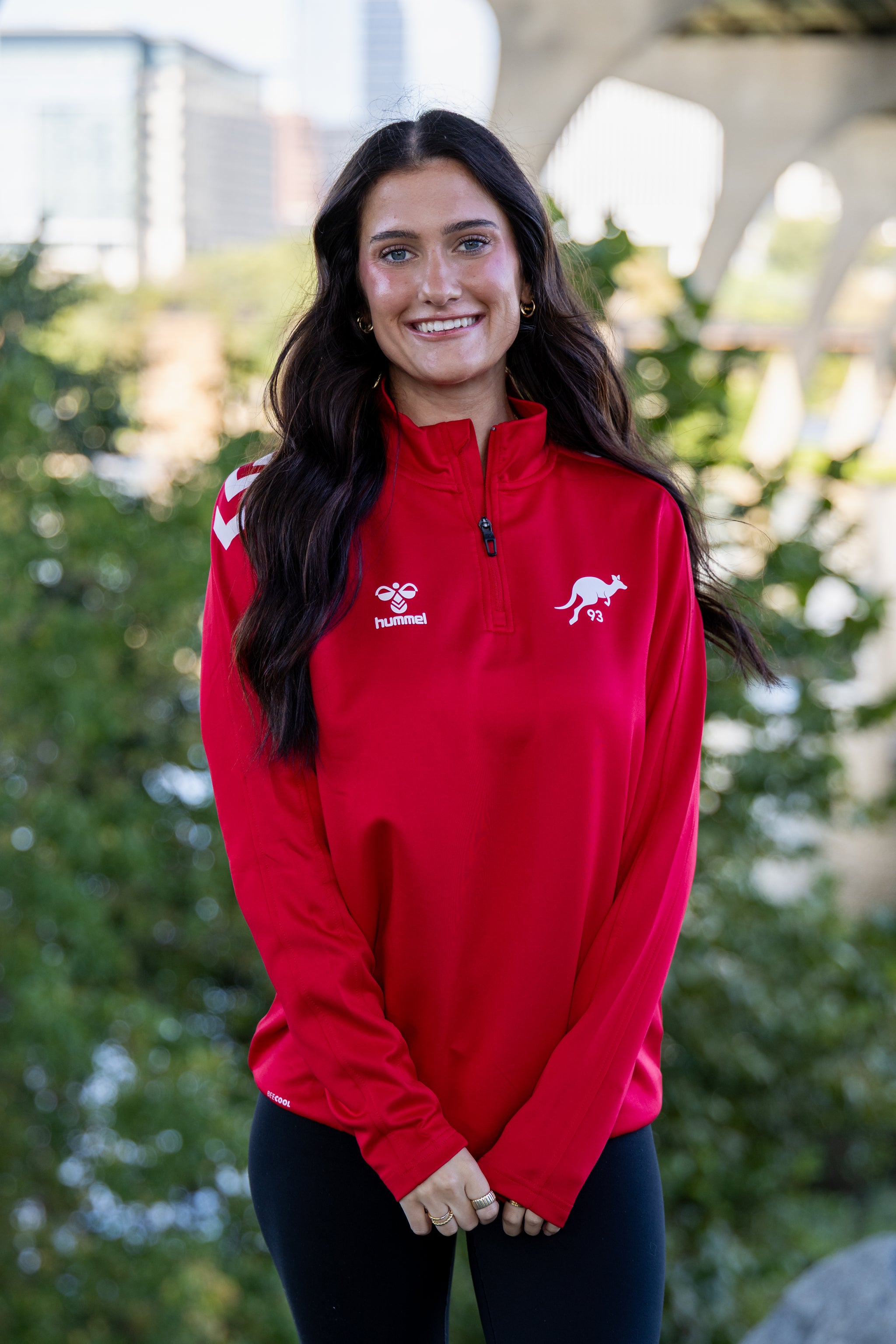 Hummel 1/4 Zip in red featuring the Roo 93 logo in white on the left chest